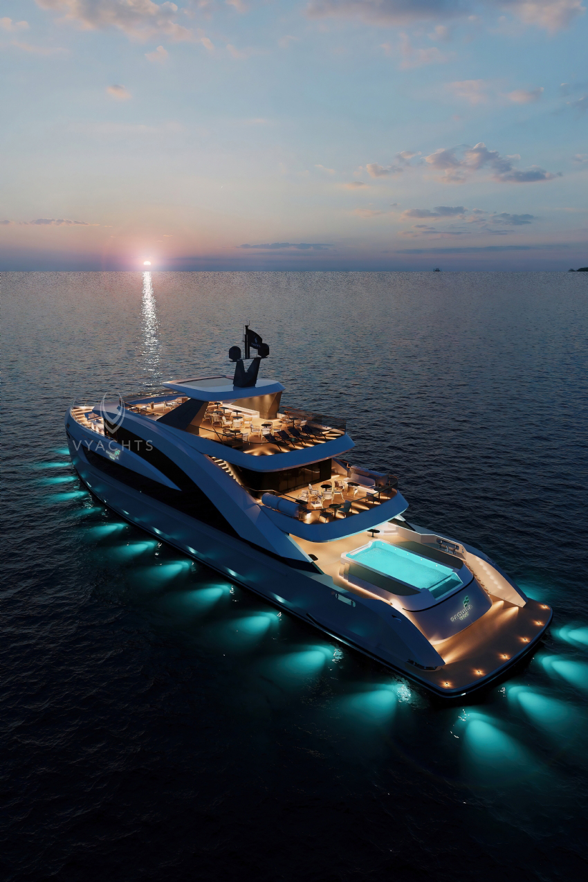 The yacht features world-class dining, a panoramic infinity pool, the Milavia Bar, and premium leisure facilities. Every detail is meticulously supervised by V Yachts to deliver a seamless journey – blending modern aesthetics with timeless elegance.